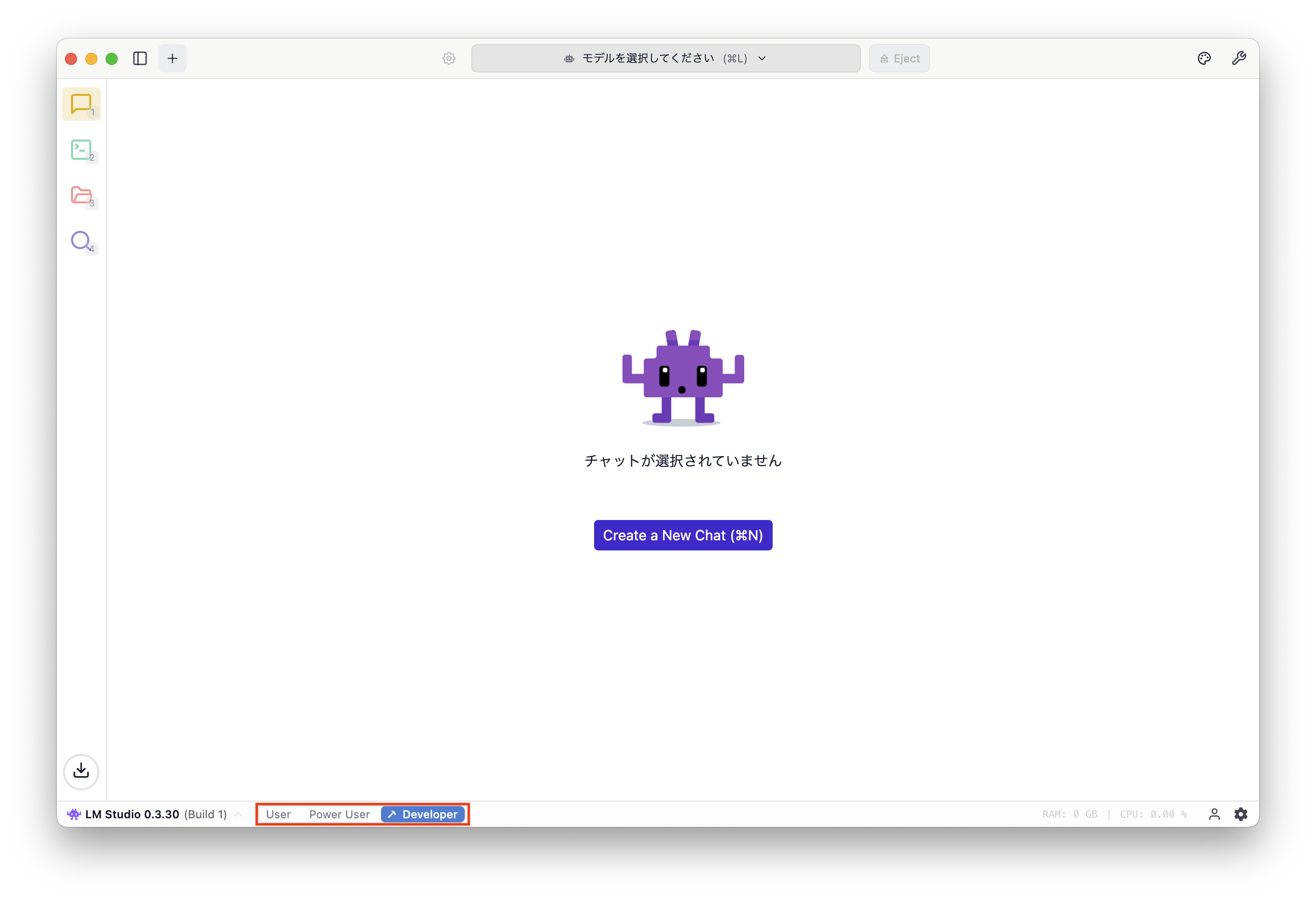 今回は、LLM を使うための API として利用したいため、アプリケーションを起動した後に Developer モードに変更する。 LM Studio を起動すると画像のような GUI アプリケーションが起動する。