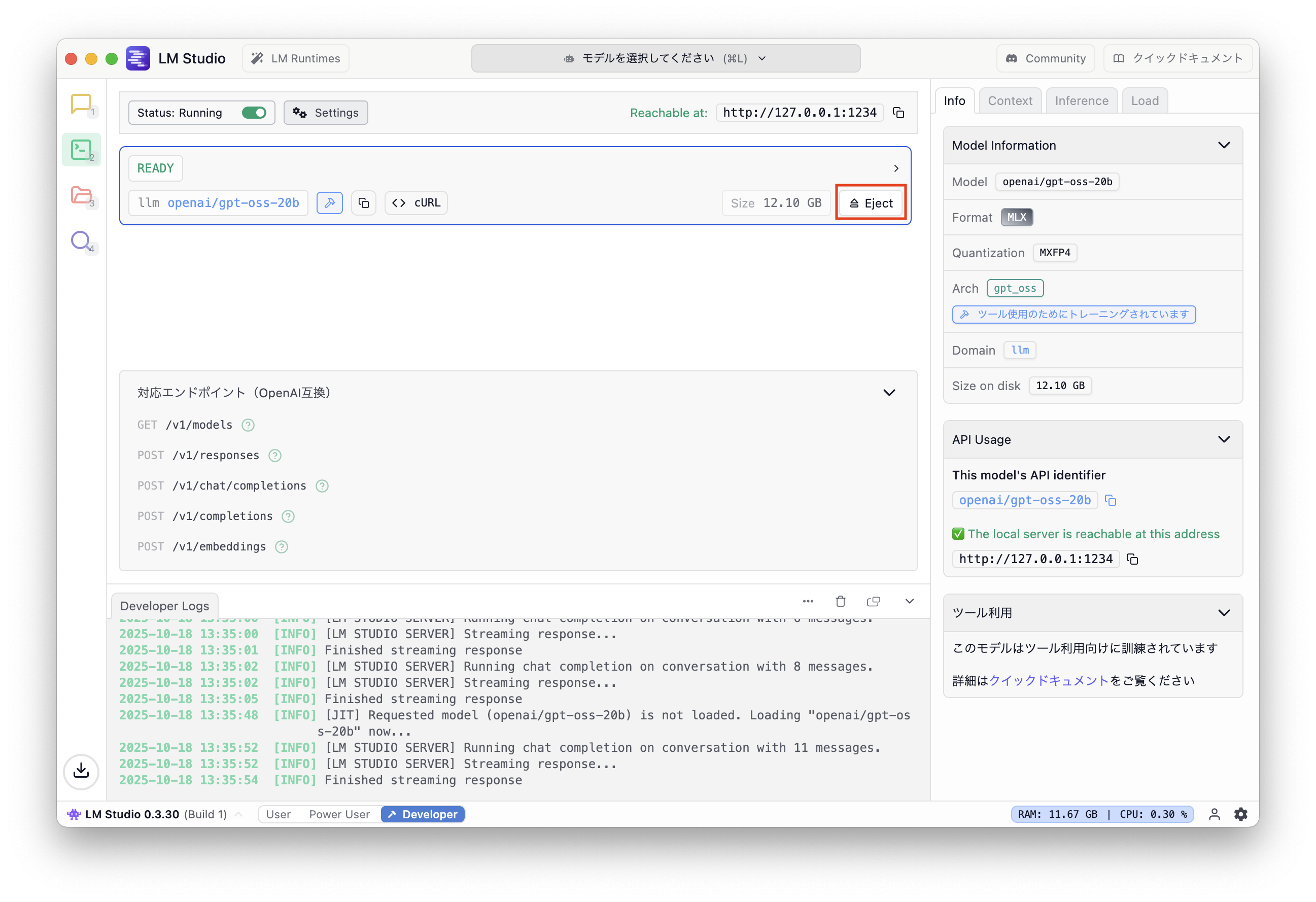 最後に LM Studio でモデルを読み込んだ後、それ以上使わないのであれば忘れずに Eject しておこう。 Development のアイコンを選択し、画像の「Eject」ボタンを押すとメモリを解放できる。