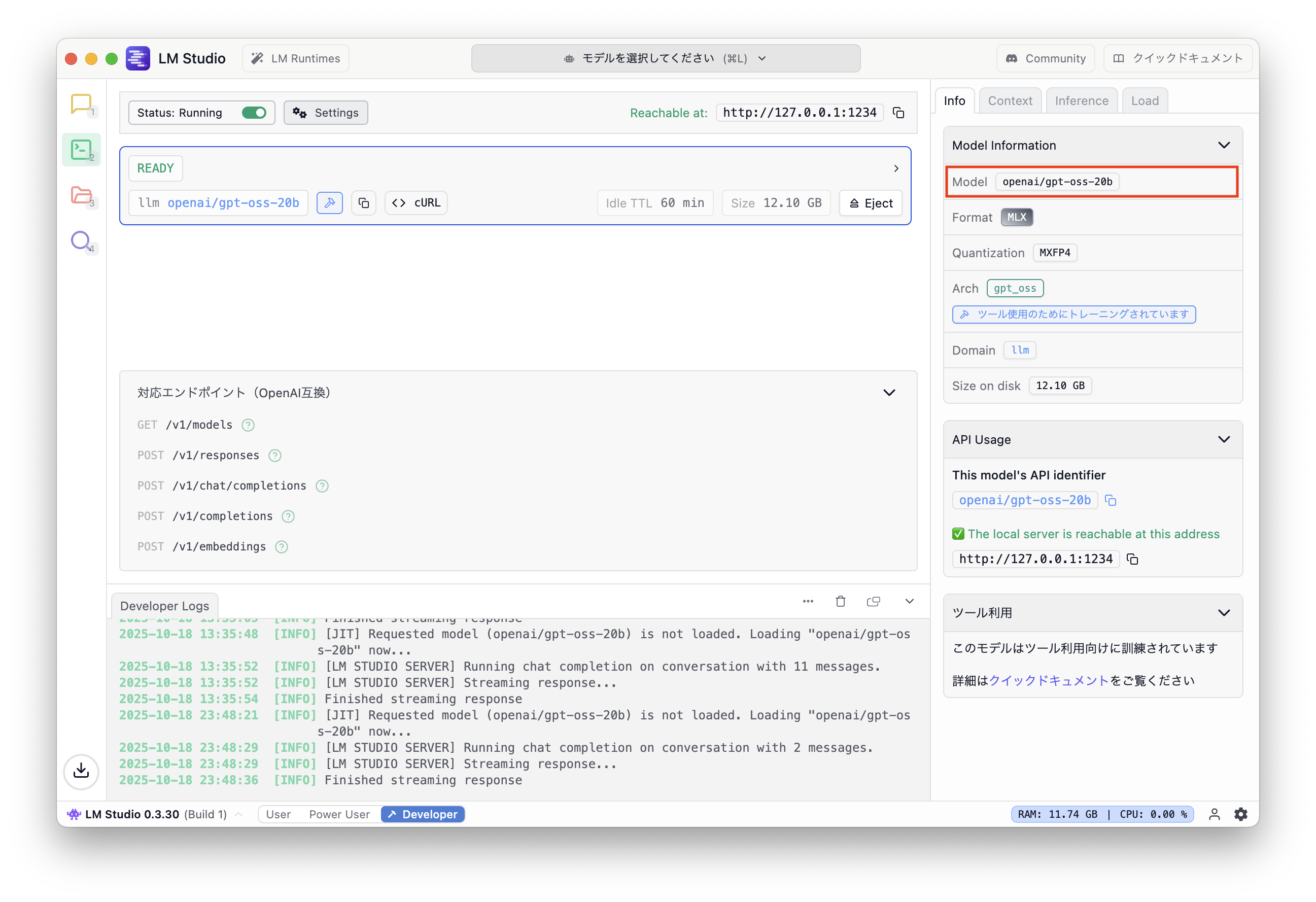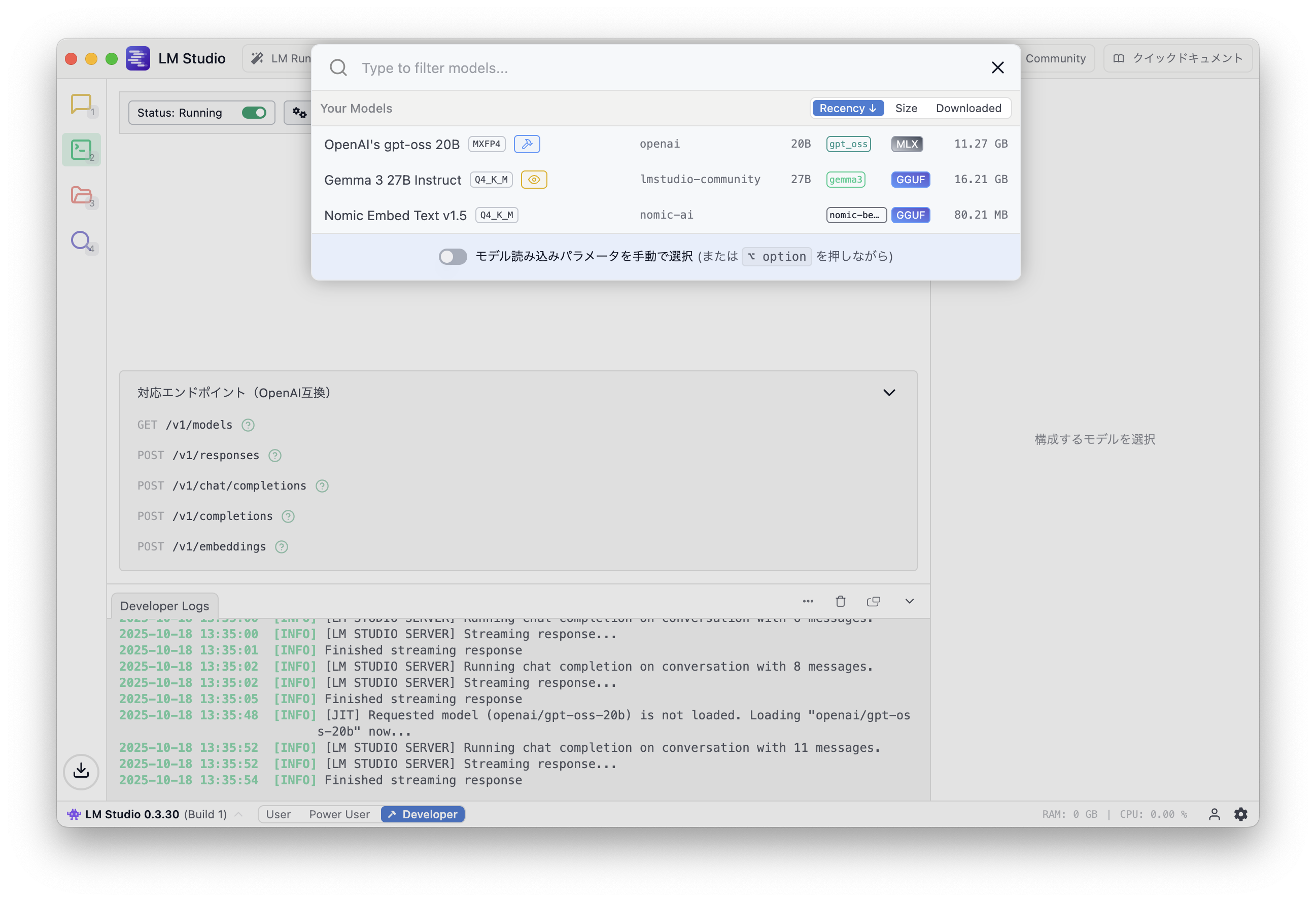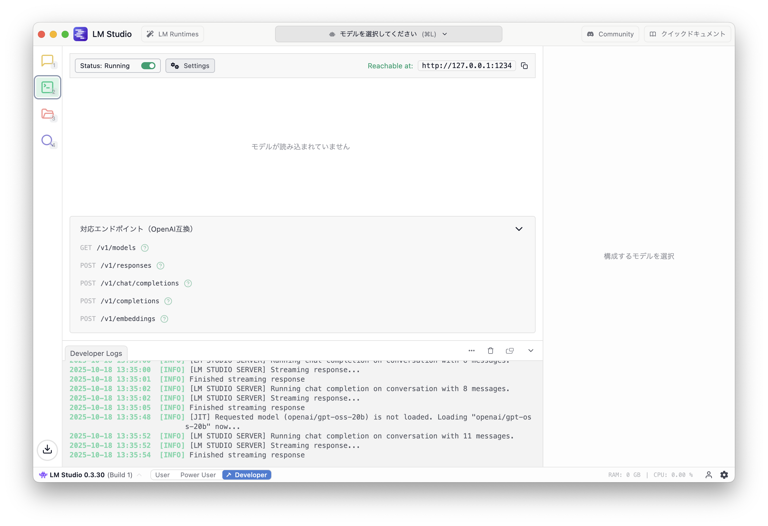 LM Studio は、Ollama と同様にローカル LLM を手軽に試すことができるアプリケーションだが、こちらは Ollma とは違って GUI アプリケーションとなっている。 Developer mode に切り替えると OpenAPI Compatible な API を使うことができるため、今回のような mastra と組わ合せて LLM を使う場合にも利用できる。