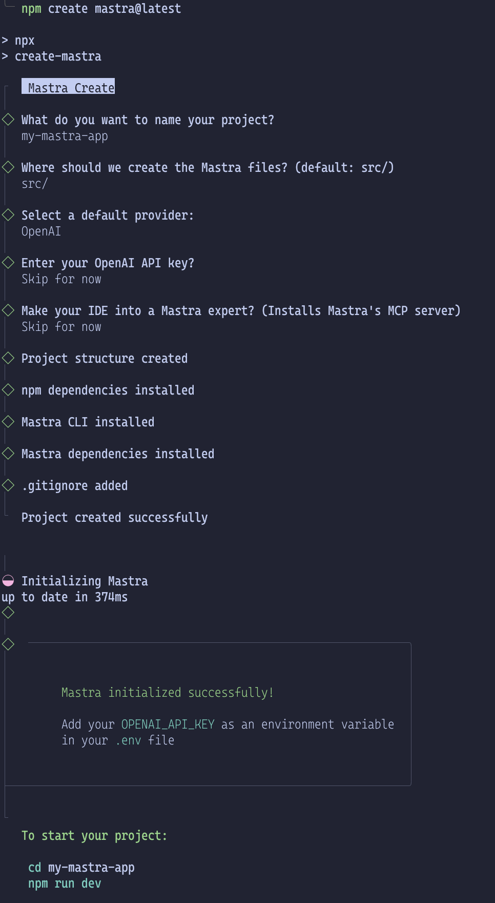 さっそく mastra のプロジェクトを作成しよう。 ドキュメントに従って、プロジェクトを作成してみよう。