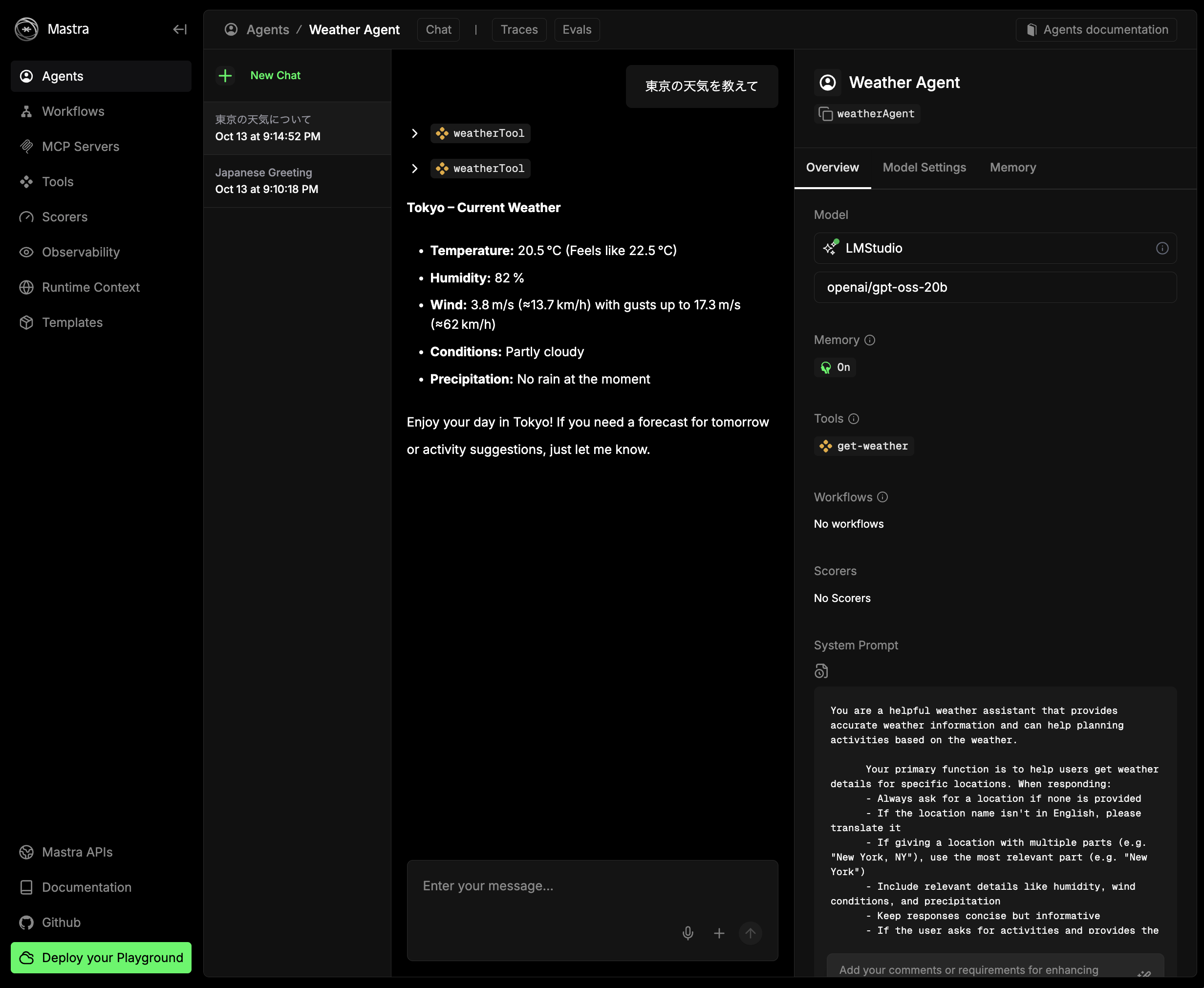 今回は、mastra のセットアップを行い、LM Studio で立てた API サーバにリクエストしてサンプルアプリケーションが動作するところまでを試す。 Ollama を使うとチュートリアル通りにやっても上手く行かない。しかし、OpenAPI Compatible API として使う方法であれば上手く行くのかと思う、がそこに行く前に力尽きてしまう予感がする。