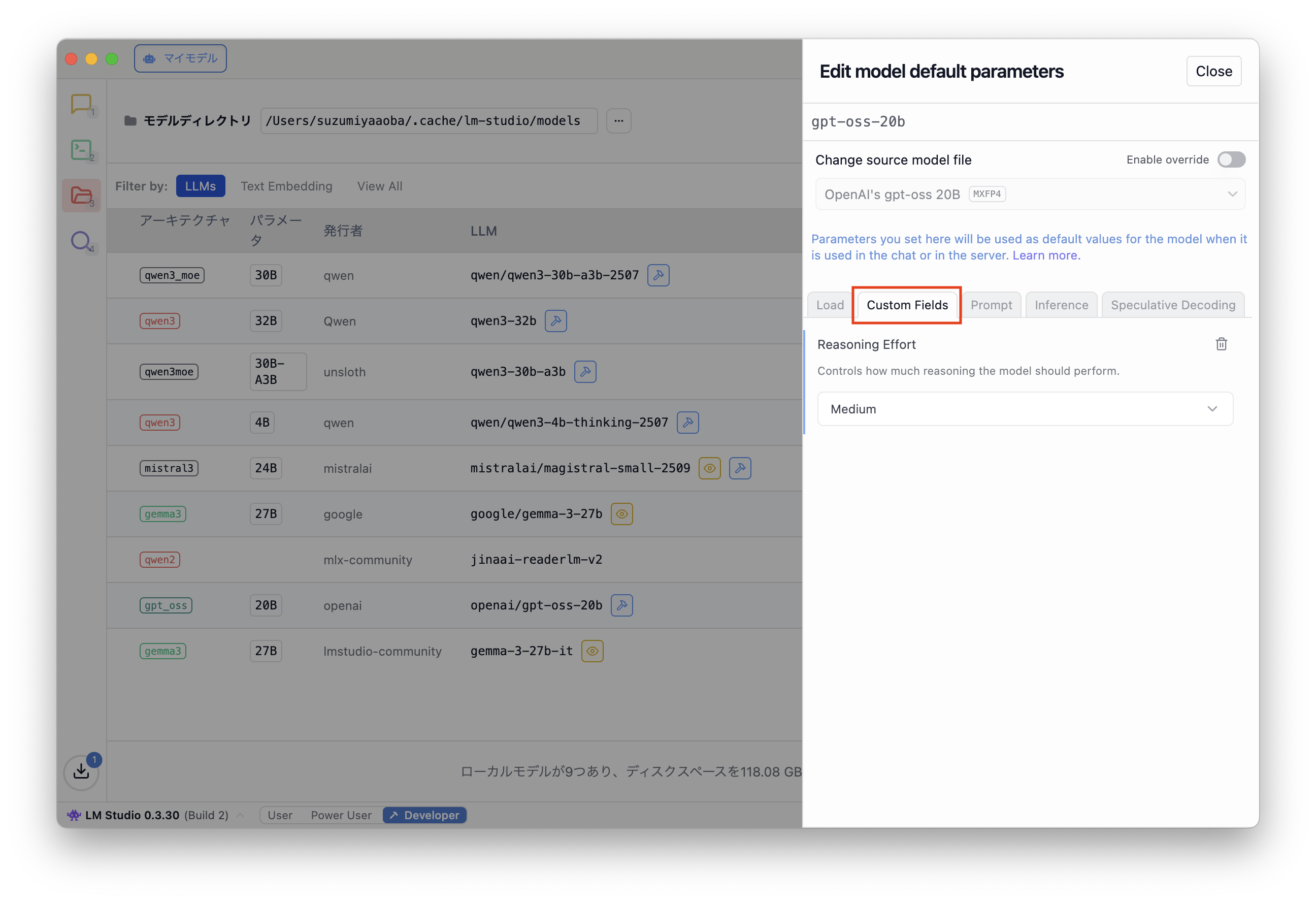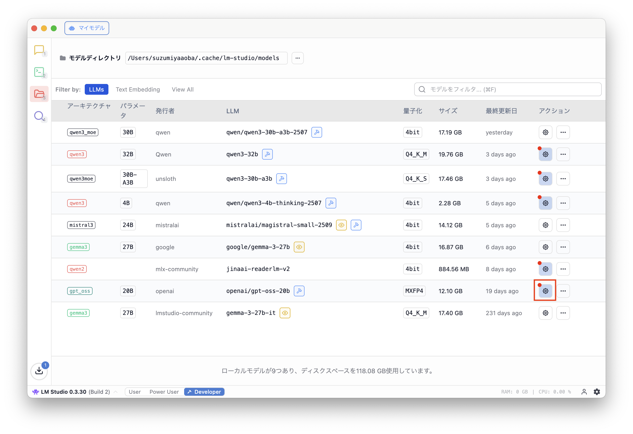 LM Studio で gpt-oss の Reasoning Effort を変更するには、LLM のリストから歯車ボタンを押して LLM の設定変更タブを開く。